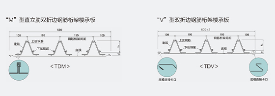 TDV、TDM鋼筋桁架樓承板由上弦鋼筋、下弦鋼筋、腹桿鋼筋、底模、支座鋼筋構(gòu)成。